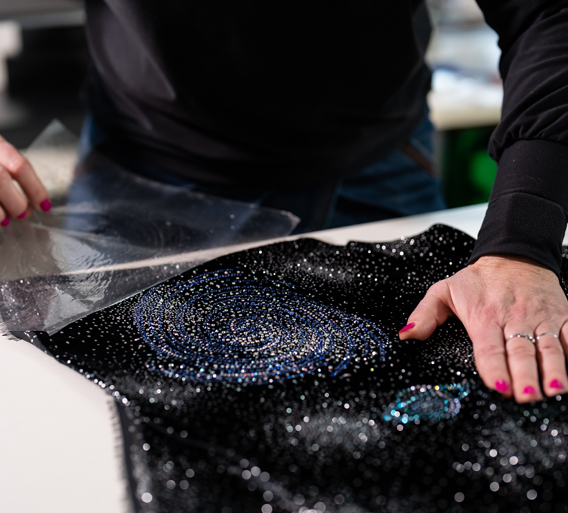 Beyond the production of made-to-order items, our experienced team of specialists is also recognized by a growing number of brands and designers for their application expertise and capabilities. Preciosa’s application services range in scope from small-scale projects for independent designers to commercial application for a variety of established European fashion and sportswear brands.